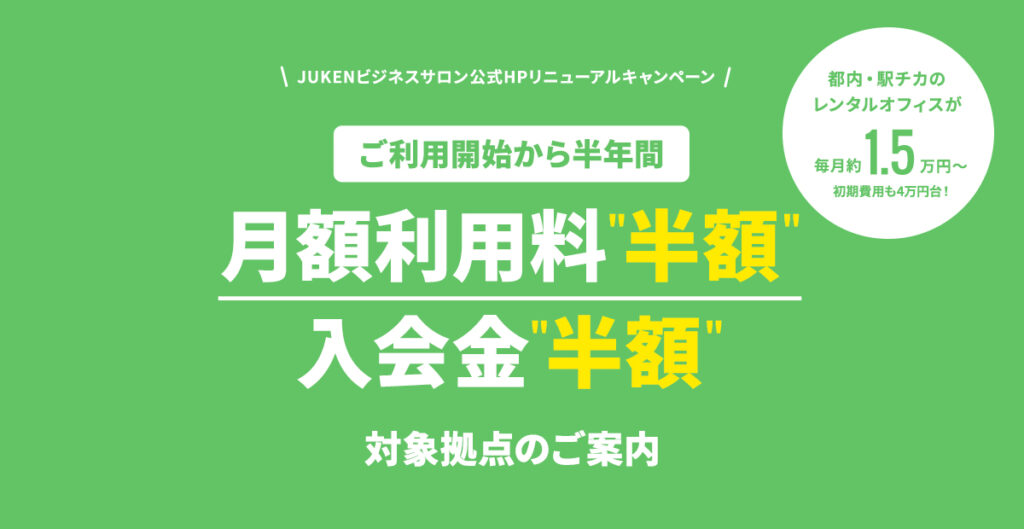 このたび、レンタルオフィス「JUKENビジネスサロン」では、HPリニューアルを記念して、対象拠点にて期間限定キャンペーンを実施しております。