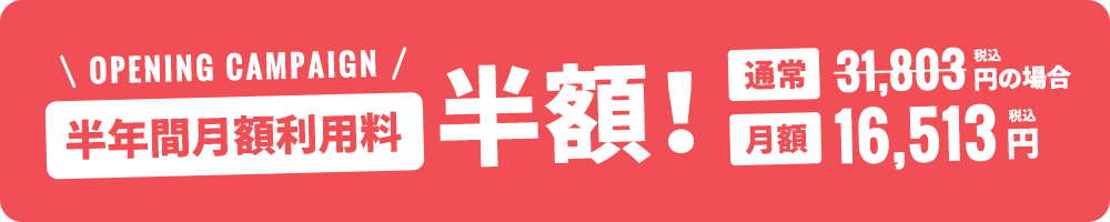 オープンを記念して、期間限定で初期費用と月額利用料(半年間)が半額となるキャンペーンを実施しております。